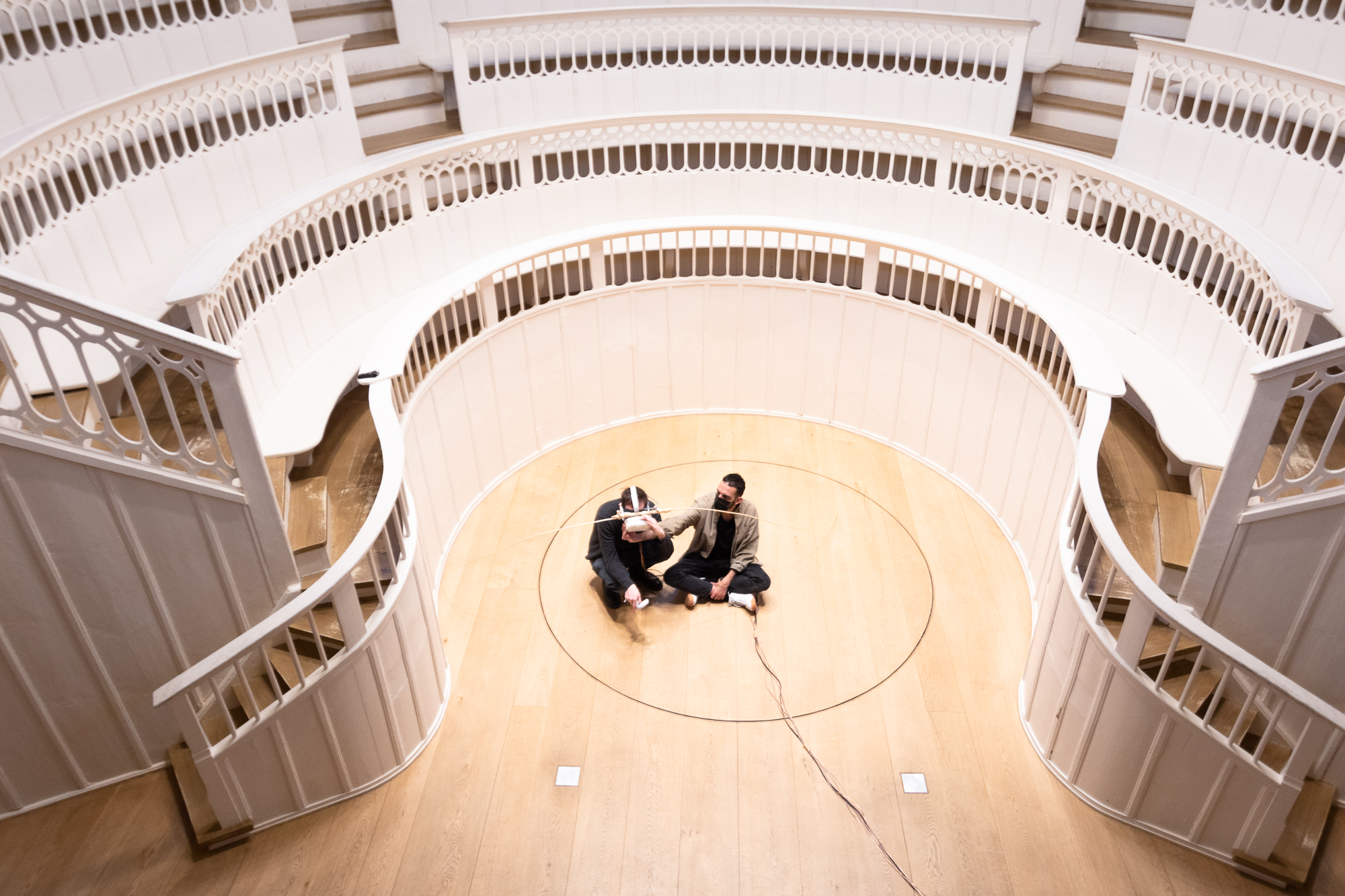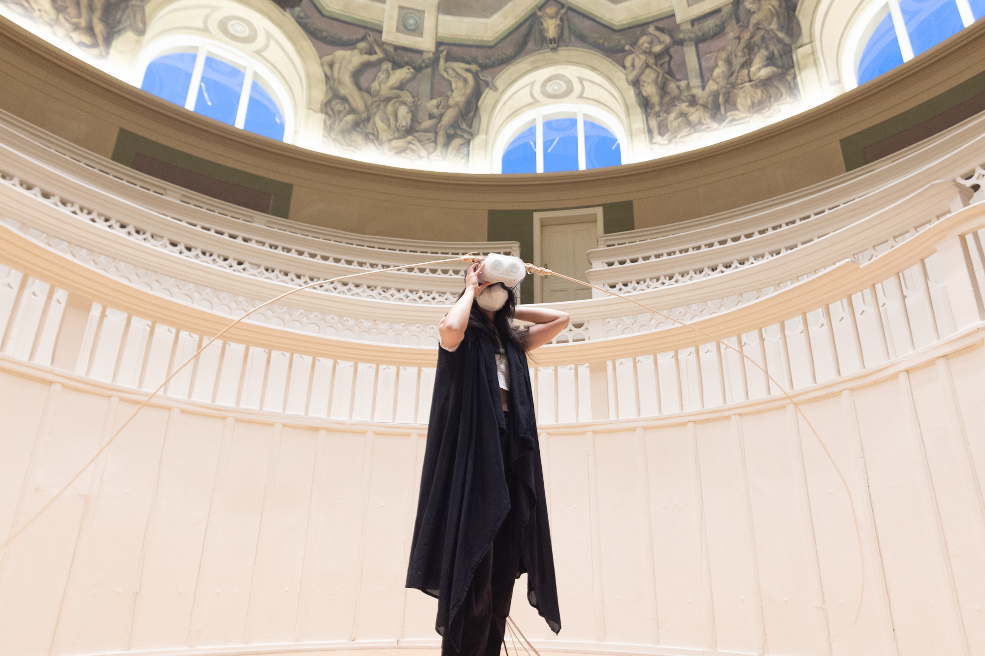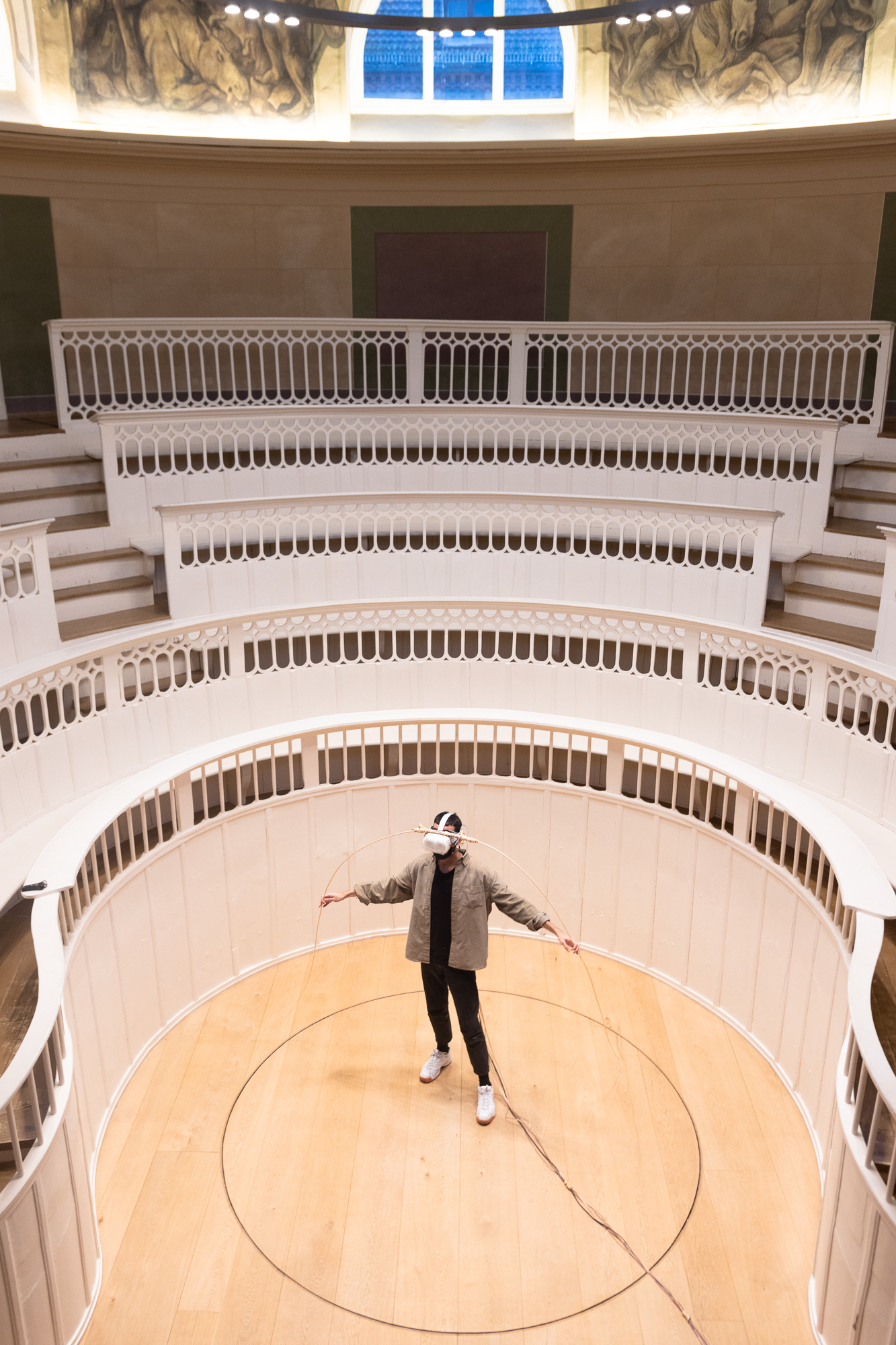 Antenna is a performative sound installation that centers around the custom-built “willowphone,” a hack of the traditional virtual reality headset, which reimagines how we engage with, and impact, our environment. This first iteration is intended for the lecture hall at Tieranatomisches Theater and selected for its acoustics. The domed ceiling creates echoes and delays, ‘throwing sounds’ in unexpected ways. Audio from the willowphone is sent to transducers mounted to the headset and room speakers, turning the space an oversized speaker and creating a multilayered experience.